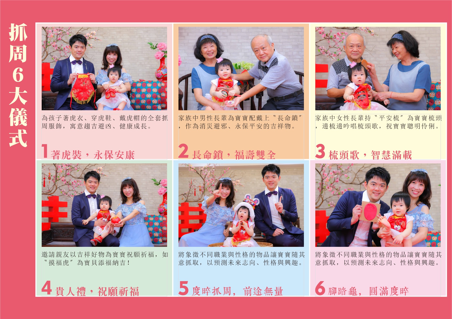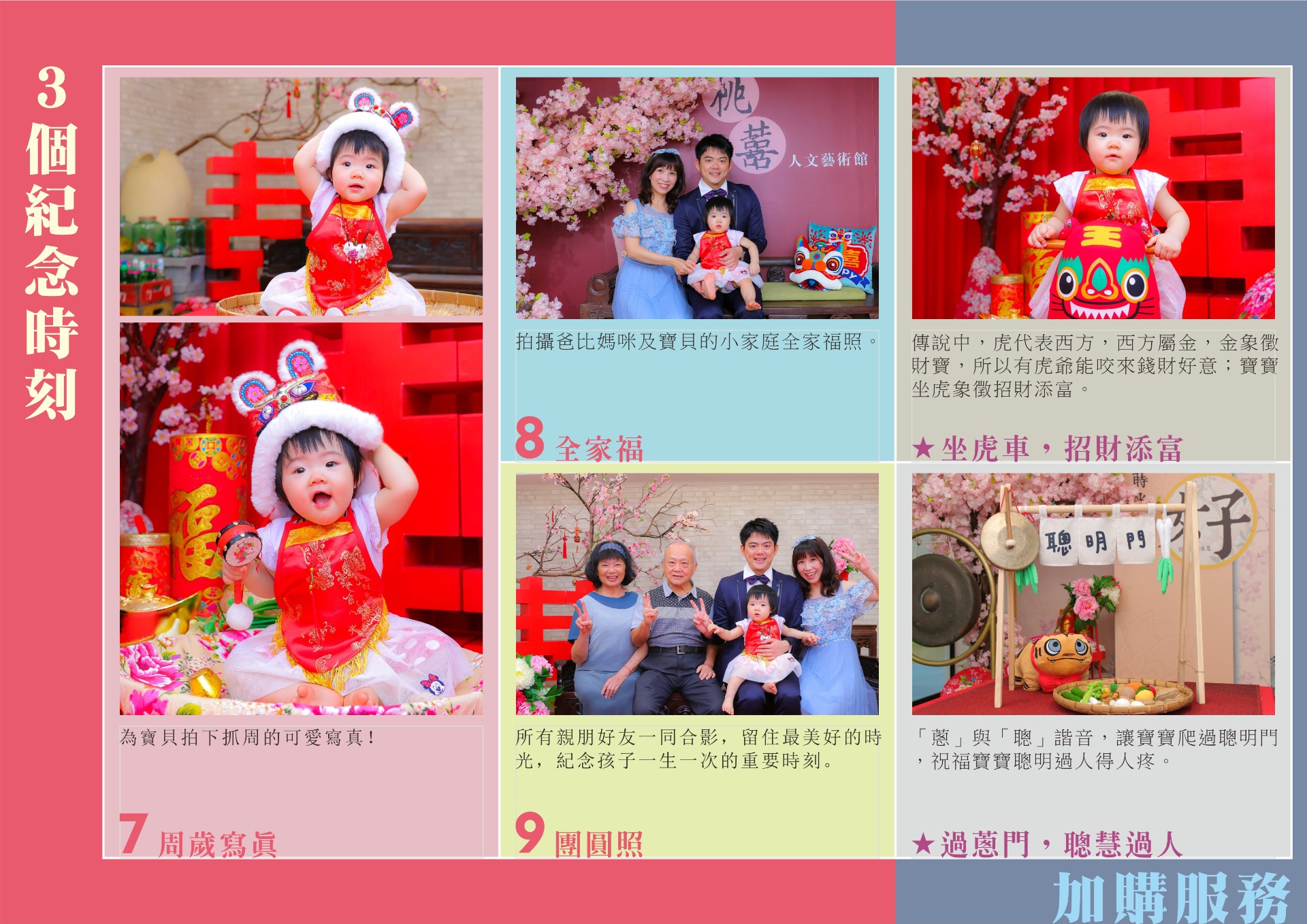 ● 內容:六大儀式 +全家福 +團圓照 +寶寶周歲寫真,儀式感拉滿。