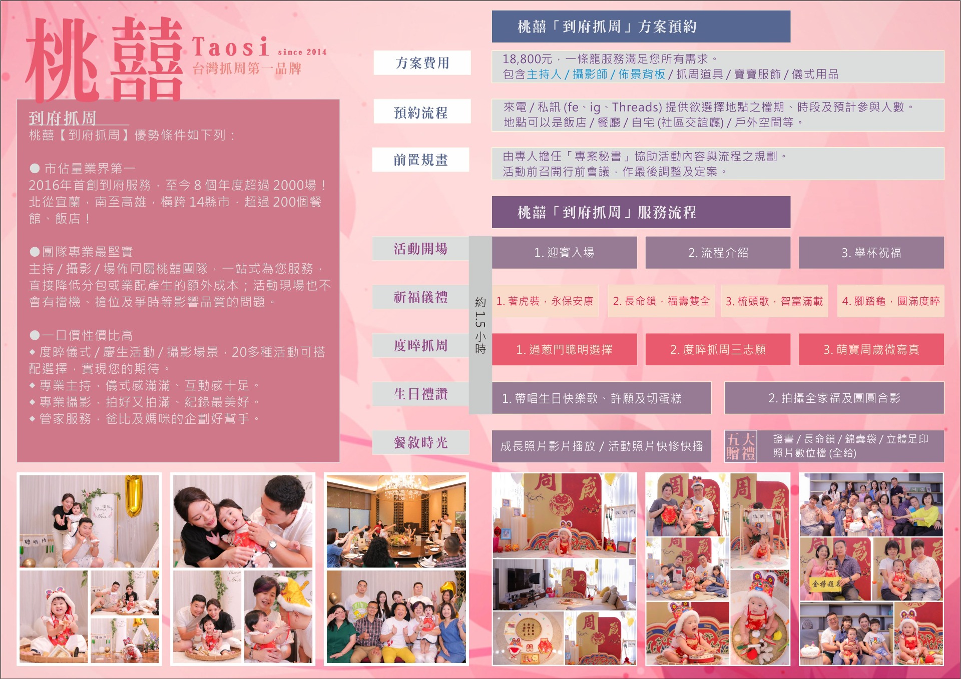 在少子化的今日,寶寶的出生和成長是家族的囍事,抓周更是寶寶第一個生日!因此,在這全家族共聚天輪的時刻,我們特別為您們拍攝全家福,一組為家庭全家福(爸比媽咪和主角寶貝),一組為家族全家福(所有與會的親朋好友),留住最美好的時光,紀念孩子一生一次的重要時刻。(建議著正式服裝出席喔!)
